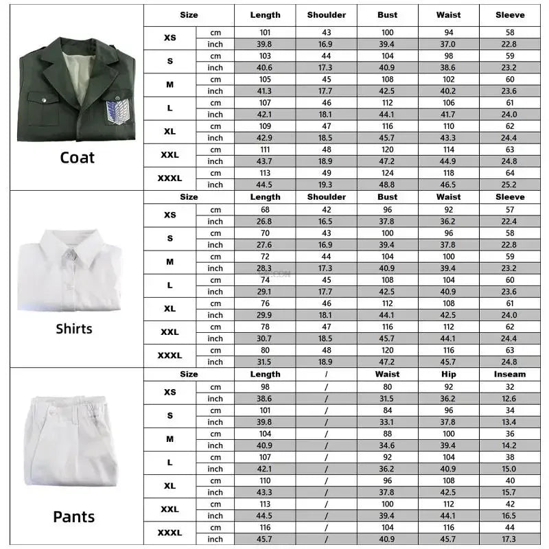 SPECIFICATIONSBrand Name: ZOBOTTCN: GuangdongCharacters: Eren LeviChoice: yesComponents: Top,Pants,trenchDepartment Name: AdultGender: UnisexHign-concerned Chemical: NoneItem Type: setsMaterial: POLYESTERModel Number: YJH-D0137L1-Origin: Mainland ChinaSource...